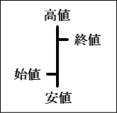 (1)まず、高値と安値を縦の直線で結びます。 (2)次に、同日の始値を直線の左側に短い横棒(ティックという)を引きます。 (3)最後に、同日の終値を直線の右側に短い横棒を引きます。 |
