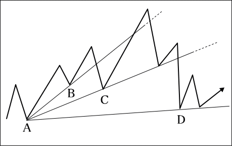 【例】 上昇扇形図Aを基点として第1のトレンドはB。このBに沿って上昇していたものが上放れて、第2のトレンドラインであるCが作られる。しかし、今度は下放れたことで第3のトレンドラインDを設定しなければならなくなる。こうしたトレンドラインが扇の骨のように見えるため扇形トレンドと言われる。