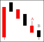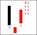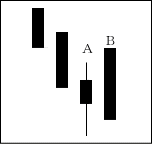 Aは下げ相場の途中、売り方の利食いを意味している。それが囮となってBが出現する形。次にBを包み込む陰線が出ると絶好の売り場となる。 【ポイント】 Bが長い陽線なら買い場なので注意。ただ、Bは陰線になることが多い。 |