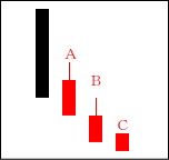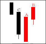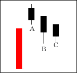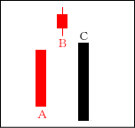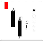 BとCはAの上影の役目をしており、上値は重い。CがBを包むことが重要で、この次に出現する線がCの下に位置する陽線ならなお良い。 【ポイント】 上昇の開始時にも出やすいので、BとCが買い方の利食いか見極めるのが必要である。 |