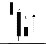 高値圏での出現は売り線であり、あくまでも続落して安値圏での出現に限る。A・Bに下影が付くと底固く推移するケースが多い。 【ポイント】 Aに短いBが孕むのが理想的である。 |