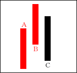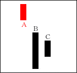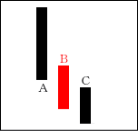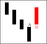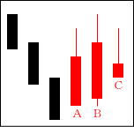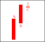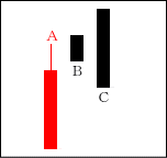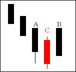 上昇ムードが強まる中、Cの陰線が入る。よく「タスキがかかる」という言い方がされる。Cは修正安となるケースが多い。 【ポイント】 AとBをつなげて一本の陽線にする。その陽線とCを比較してみる。 |