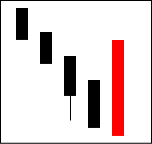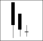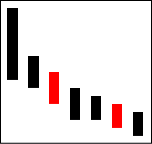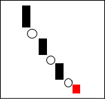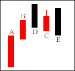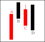 下落相場の一服となる場合が多い。A、B、Cと上に行きたがっているのに上影をひいて上値が重い。続落に対する無駄な抵抗と考えて良い。 【ポイント】 再度下落となり、抵抗が大きかったのであれば大幅下落を期待する |
