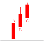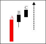 相場が上昇に転じた際に出るケースが多い。Aの後、BがAの引け値より、高く寄り付いて、かぶせる形となる。CはBをかぶせる。 【ポイント】 BとCはAよりも短い線でAの上部に位置するのが良い。 |