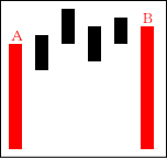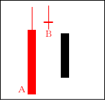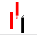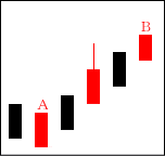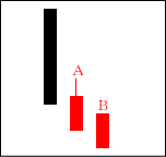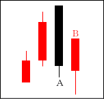 高値圏で天井を打つ場面や、中段での戻り場面によく出現する。Bで上に行こうとするものの、Aで完全に否定された形となる。 【ポイント】 BよりAが長ければなお良い。天井圏では大幅下落も期待できる。 |