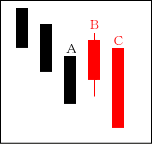 続落し、安値圏でAがCに食い込んでCの中心値以上の所で引けると強気。その後、Bが出現したら完全強気となるケースが多い。 【ポイント】 あくまでAの引け値が、Cの中心値以上となること。 |