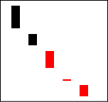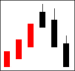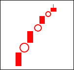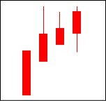 これもかなりの強気の相場と見えるが、陽線に上影がついており、上値が重い。相場は戻りたがっており、一段高の可能性は極めて低い。 【ポイント】 ここで右記のように、陰線が混じってくると転換場面は近いと言える。 |