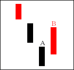 Aは下に向かいたいし、Bは上に向かいたい。しかし、この場合は、Aを踏み台としてBが上昇に向かう。週足チャートで出現は高確率。 【ポイント】 上影や下影がないことが特徴。影があると全く別の動きになってしまう。 |
